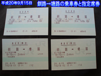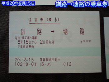こちらが、指定席券です。『くしろ湿原ノロッコ4号』。切符に書かれているとおり、9月15日の14:52発の列車です。 |