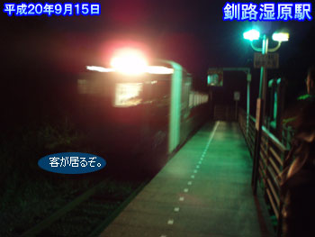 待つこと30分。真っ暗になった釧路湿原駅に1両の列車が到着です。写真ではどんな列車かも判別できない状況ですが、普通列車の釧路行きです。 |