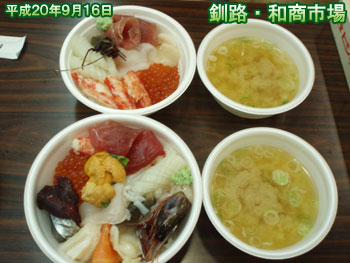 9月16日。4日間の旅行も後半になりました。この日は朝食で釧路の和商市場で勝手丼(海鮮丼)を食べた後、レンタカーを借りてオンネトーと阿寒湖へ行き、阿寒湖の旅館で宿泊しました。 |