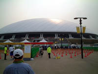 到着!ビッグアイ! やっとたどり着きました。サポーターは、観戦の前に、こうやって準備運動を行っている(正確には行わされている)ことが分かりました。 |