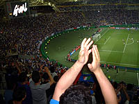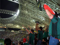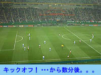 さぁ!試合が始まった!! キックオフのとき、カメラのフラッシュでスタンドがきれいですよね。俺もあれに参加しました。ただ、ちょっとタイミングは遅い。キックオフのときにデジカメの電源が入ってなかったのがマズかった。。。 |
