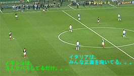 後半戦ロスタイム。やる気のなくなった両チーム。 後半戦のロスタイムは4分だったのですが、この間に同じGグループのクロアチア×エクアドルの試合が終了。その時点で、ここで試合をしているイタリア・メキシコは決勝トーナメントに進出が決定したため、両チームともやる気なしの状態に。今までとのギャップが面白なと。 |