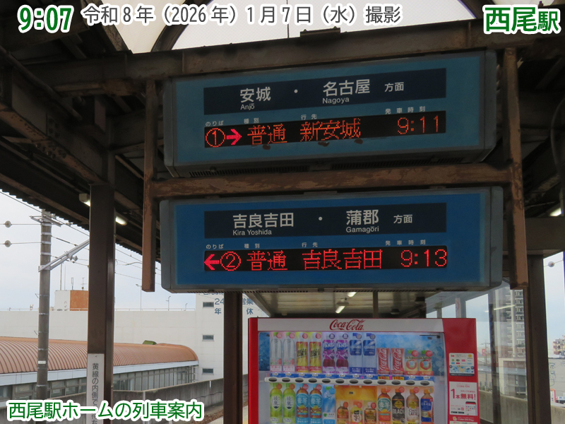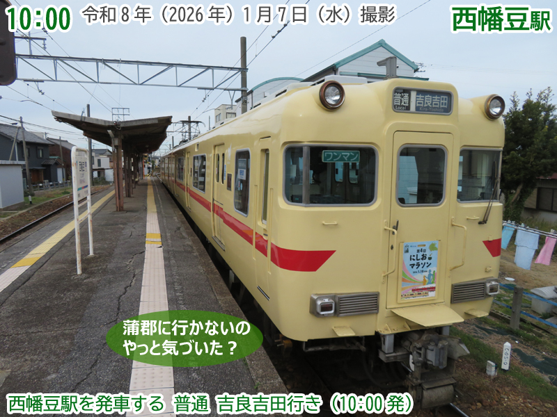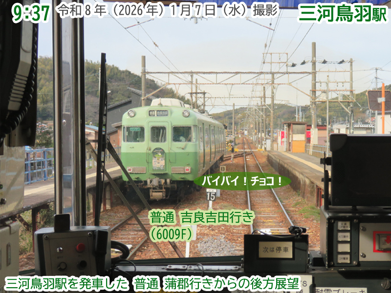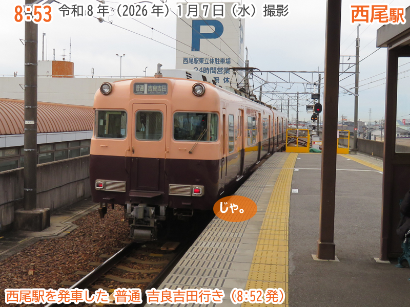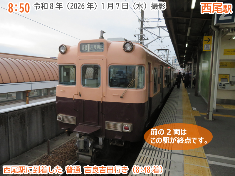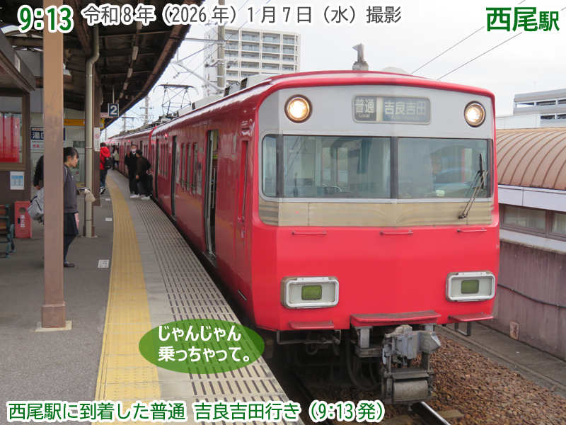 おはようございます。令和8年(2026年)1月7日水曜日、時刻は朝8時50分です。普通吉良吉田行きに乗って西尾駅に到着しました。4両のうち後ろ2両は蒲郡線用のチョコレートツートン6010Fで、西尾駅で前2両を切り離し、西尾駅から吉良吉田駅までは2両編成で運行されます。