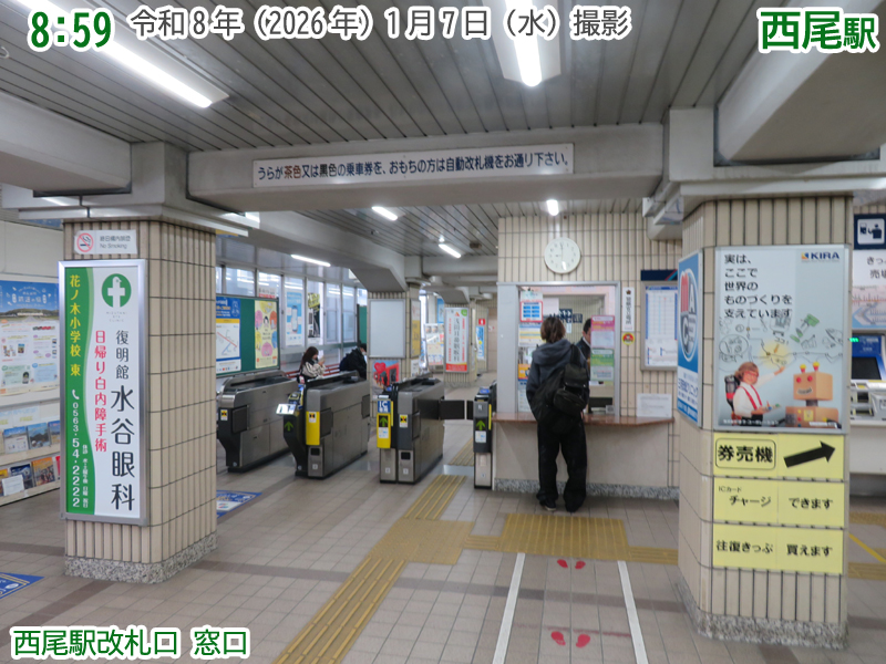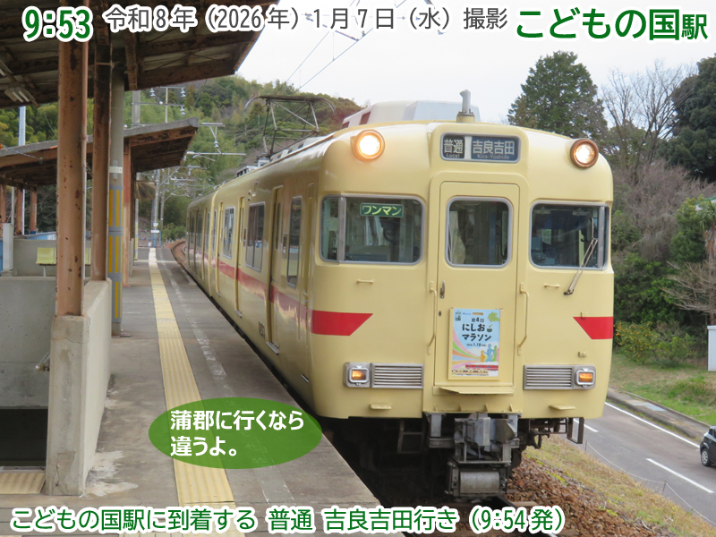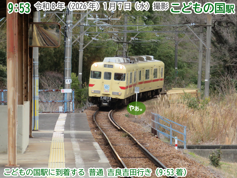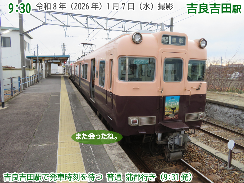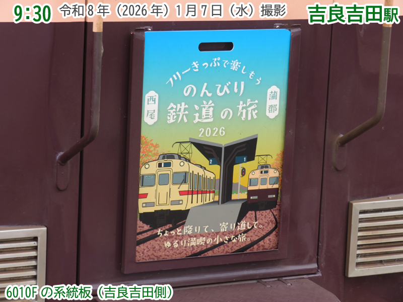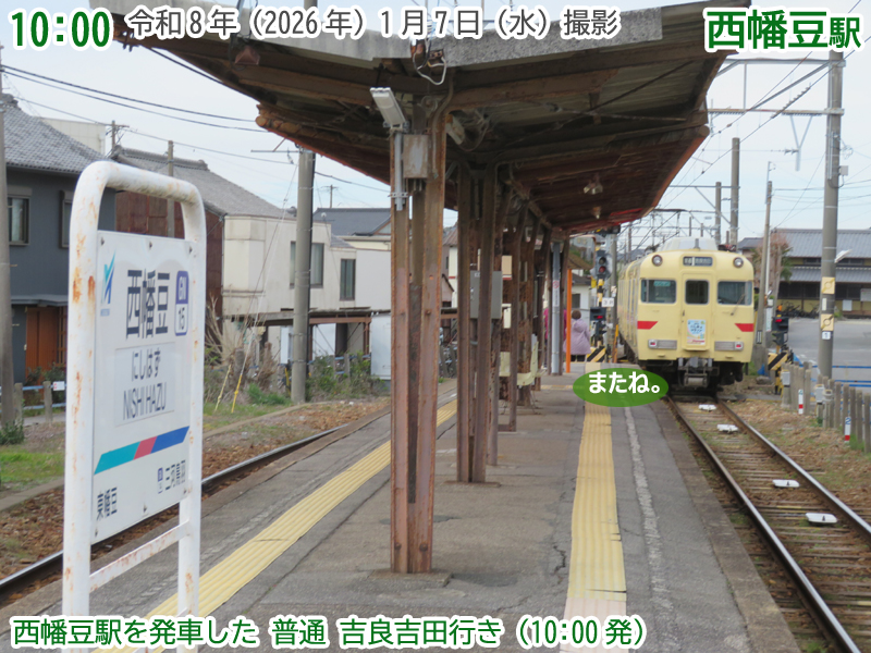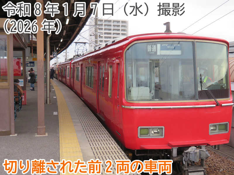 おはようございます。令和8年(2026年)1月7日水曜日、時刻は朝8時50分です。普通吉良吉田行きに乗って西尾駅に到着しました。4両のうち後ろ2両は蒲郡線用のチョコレートツートン6010Fで、西尾駅で前2両を切り離し、西尾駅から吉良吉田駅までは2両編成で運行されます。