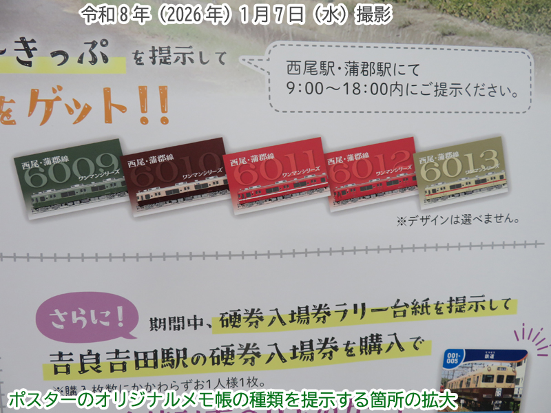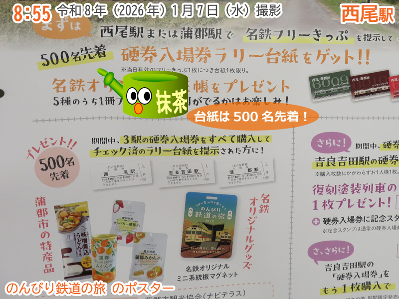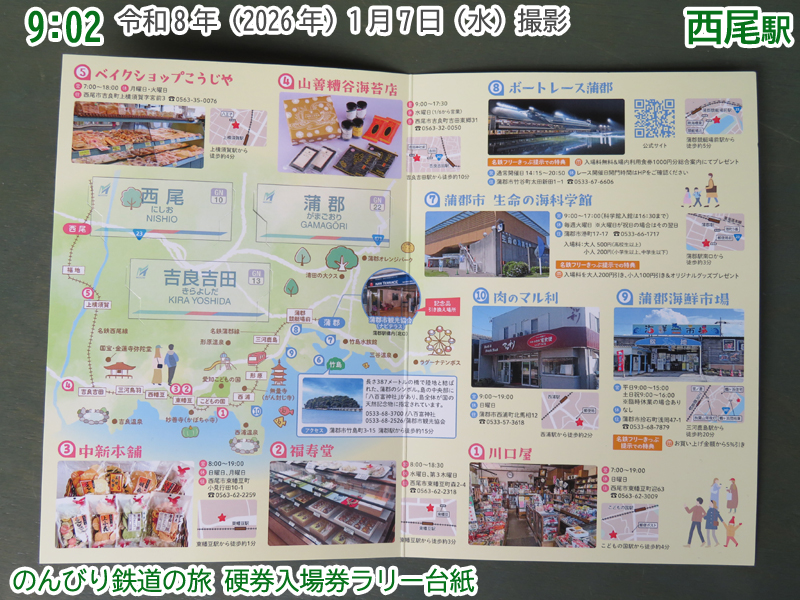 今年も『西尾と蒲郡のんびり鉄道の旅』の紹介です。令和8年(2026年)1月4日から2月1日まで名鉄西尾・蒲郡線活性化協議会の主催で開催されているイベントで、5年前と4年前はスタンプラリー、3年前は硬券入場券ラリー、2年前は駅名標マグネットラリー、昨年は名鉄特急車両硬券入場券ラリーでしたが、今年は3年前と同じ『硬券入場券ラリー』となりました。今年は1月7日(水)に参加してきましたので、その様子を紹介したいと思います。それでは、ご覧ください。 |