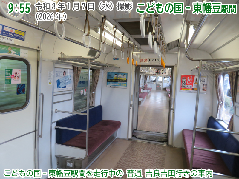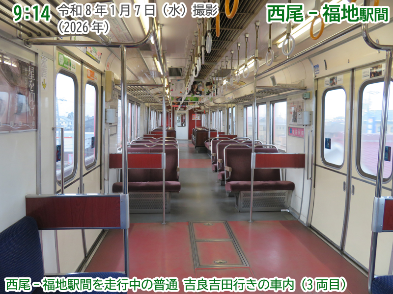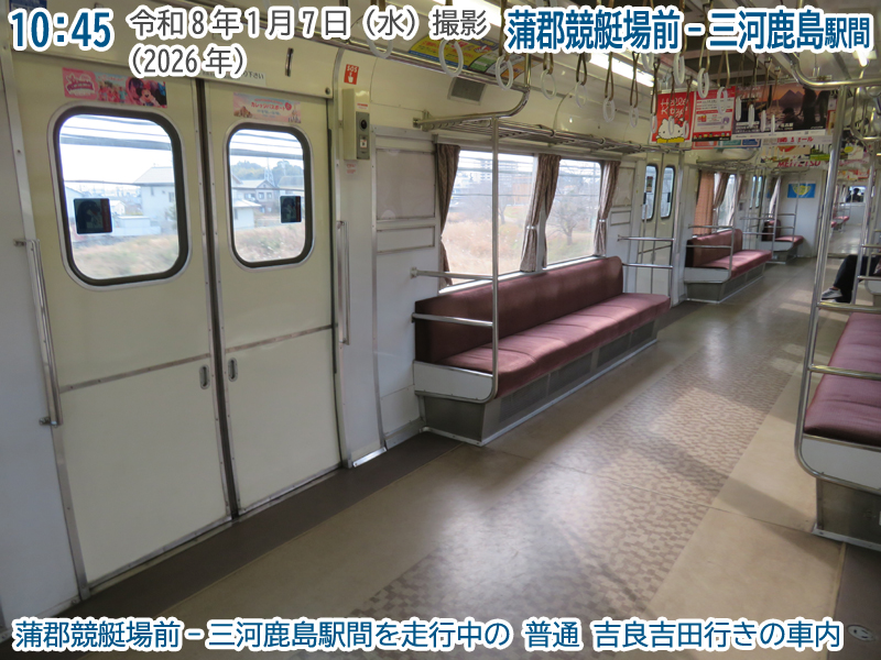 普通吉良吉田行きが発車しました。この先は前方にホームの出入口がある駅ばかりなので、1両目に近づくほど混雑しています。ここは3両目なので閑散とした車内です。
