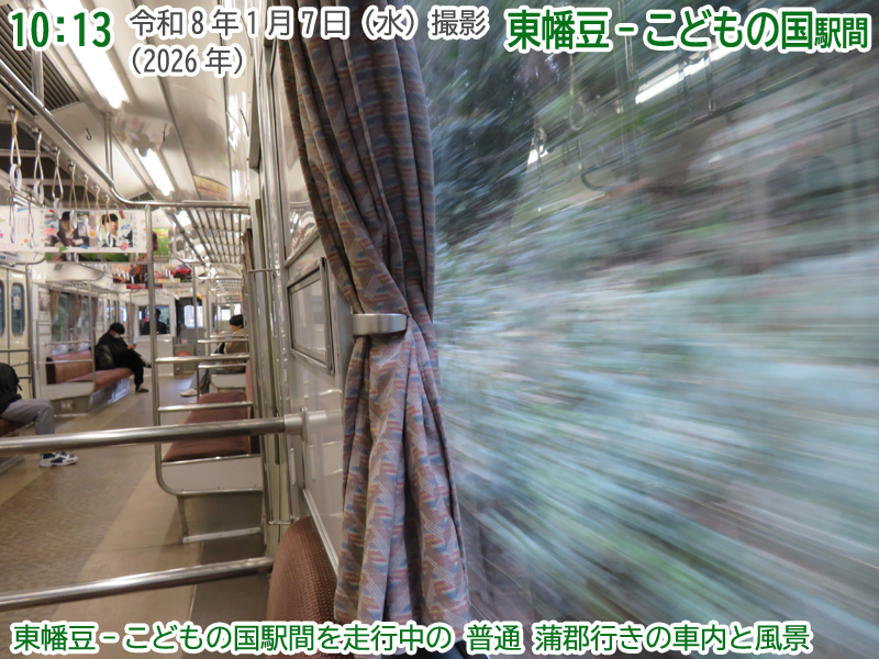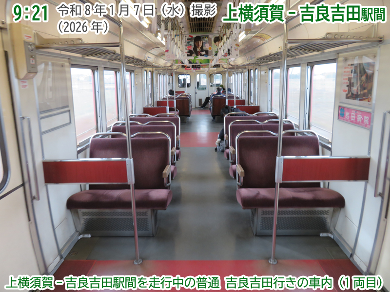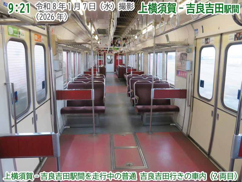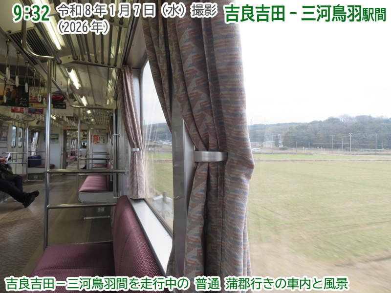 福地駅と上横須賀駅に停車し、次の停車駅は終点の吉良吉田です。1両目に近づくほど混雑しており、2両目なので閑散とした車内です。