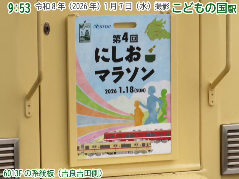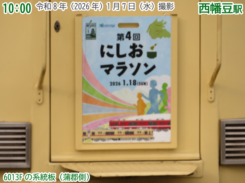 『にしおマラソン』の系統板が掲げられています。通常は白帯の6011Fに掲出されますが、今日は白帯が蒲郡線の運用に就いていないので、この列車に掲出されています。マラソンで白帯といえばゴールテープかなと思いますが、今日は白帯ではなく赤帯で、旅もゴールではなくまだ道半ばです。