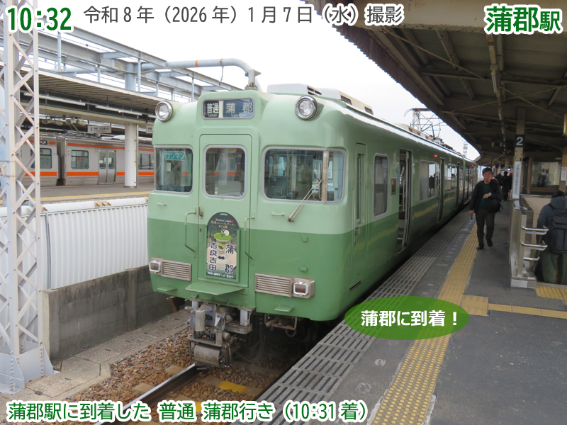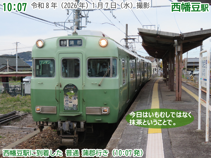 普通蒲郡行きの到着です。往年活躍した車両『いもむし』の復刻塗装ですが、西尾に来ているので『抹茶色』の車両と紹介させていただきます。