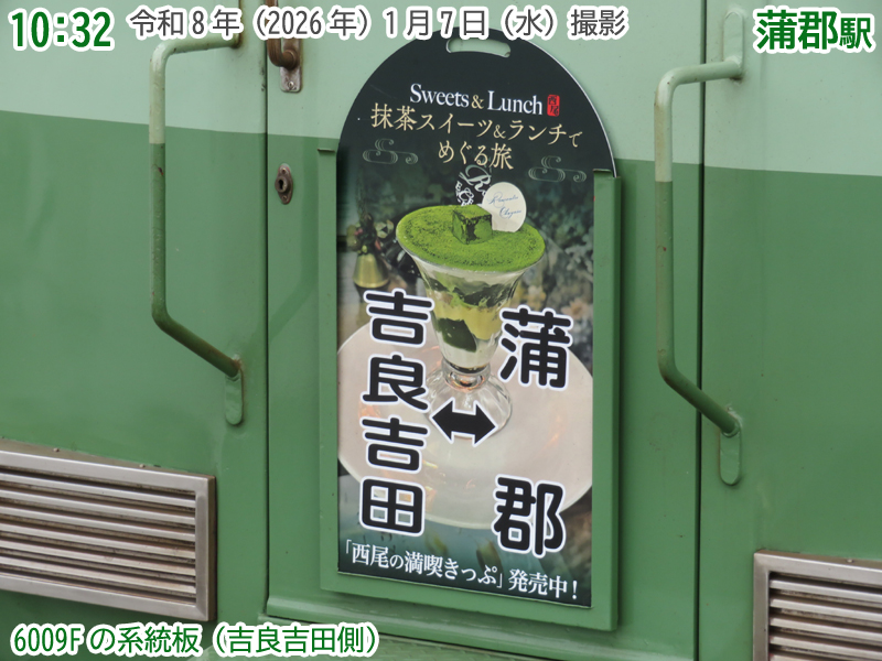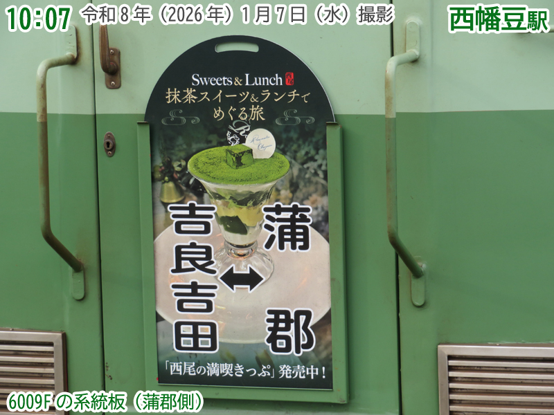 抹茶色の6009Fには『西尾の満喫きっぷ』の系統板が掲げられていました。