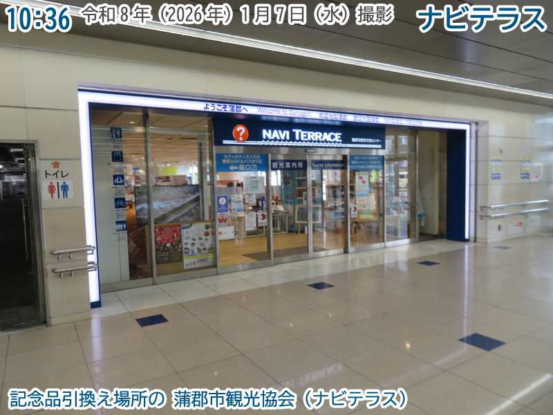 それでは、記念品をいただきたいと思います。引き換え場所は、蒲郡駅にある蒲郡市観光協会、ナビテラスです。台紙を提示すると記念品が貰えます。