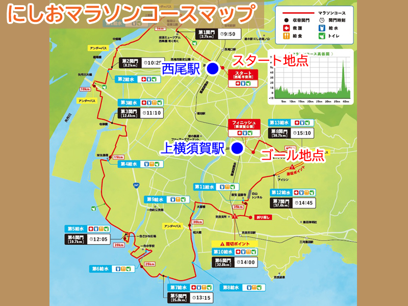 コースは西尾市役所前をスタートし、西尾市内をまわって横須賀公園がゴールになります。スタートの最寄り駅は西尾駅、ゴールの最寄り駅は上横須賀駅です。