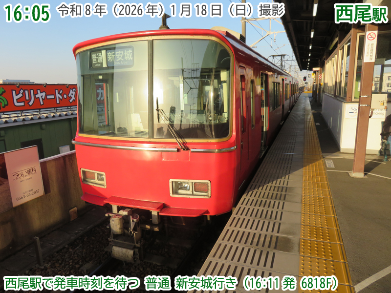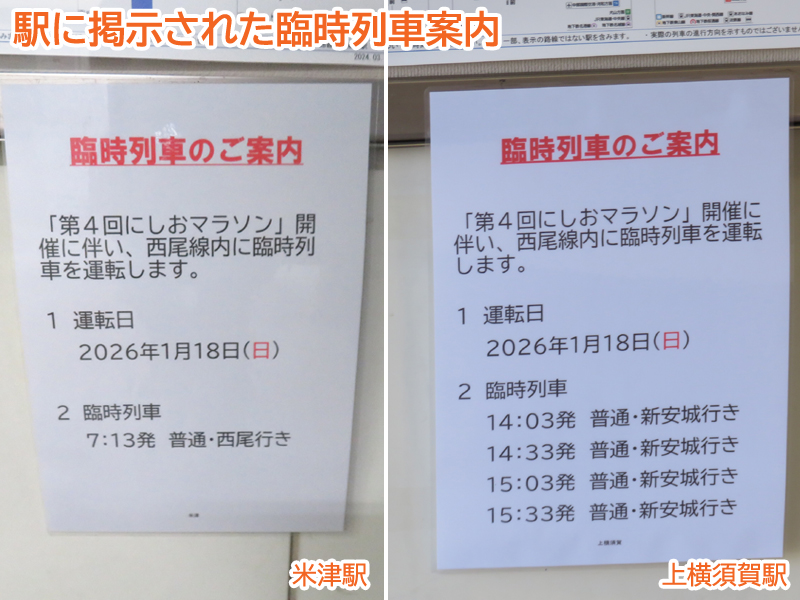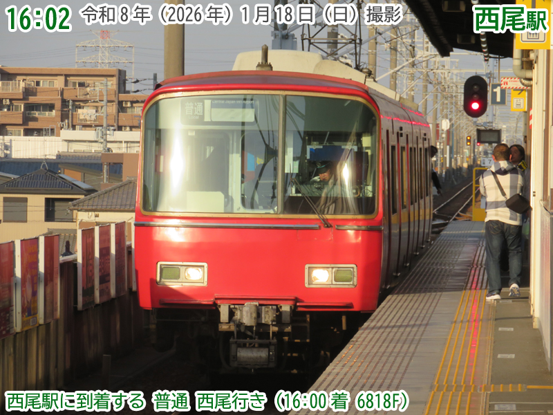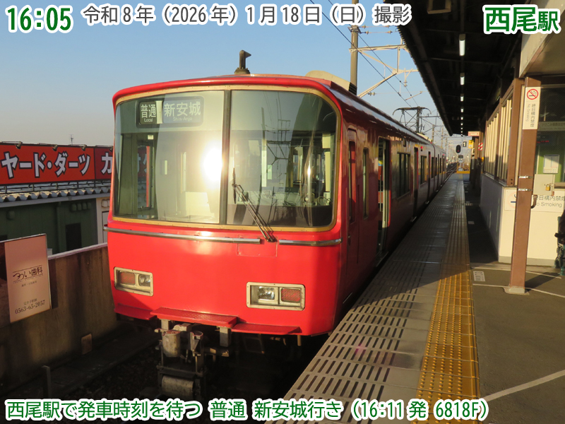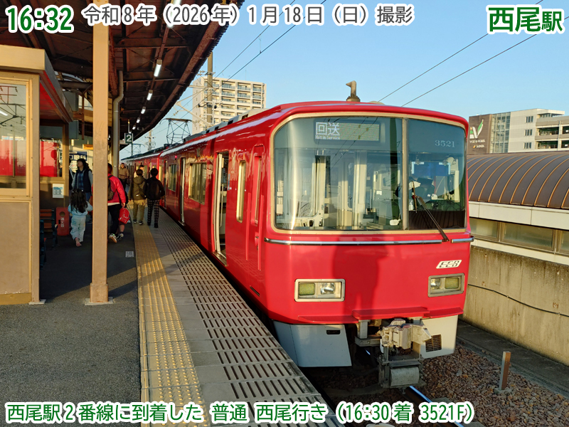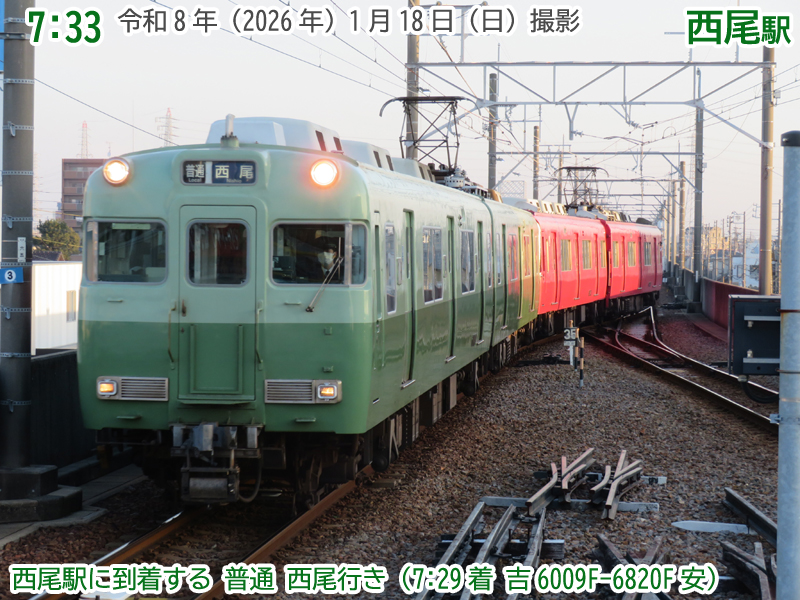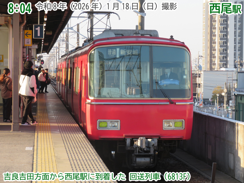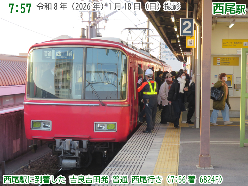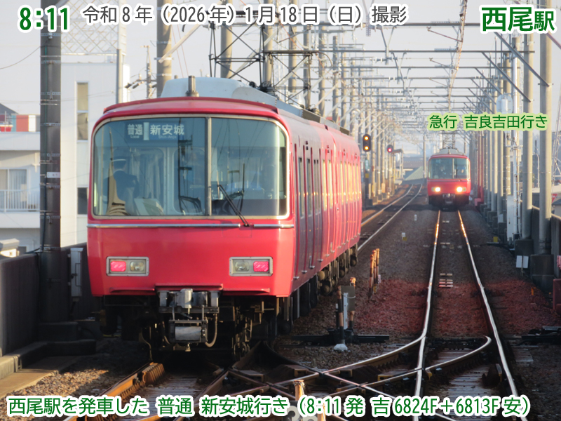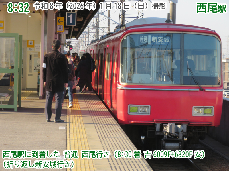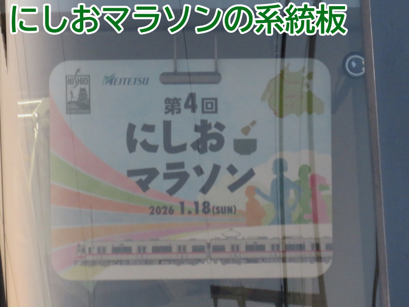令和8年(2026年)1月18日の日曜日、西尾市内で『第4回にしおマラソン』が開催されました。フルマラソンは西尾駅が最寄りの西尾市役所を朝9時にスタートし、西尾市内をぐるっと周り、上横須賀駅が最寄りの横須賀公園がゴールとなります。西尾市長のブログによると、参加人数はフルマラソンの部に6,442人、5kmの部に471人、2kmの部に488人で合計7,401人と過去最高だったようで、西尾線もたくさんの人が利用していました。西尾線では輸送力を増強するため、臨時列車の運行や列車の区間延長がなされ、車両の増強も図られました。ということで、今年も結構なボリュームでその様子を紹介します。ちなみに、昨年度はここ、一昨年度はここで紹介しています。それでは、ご覧ください。 |