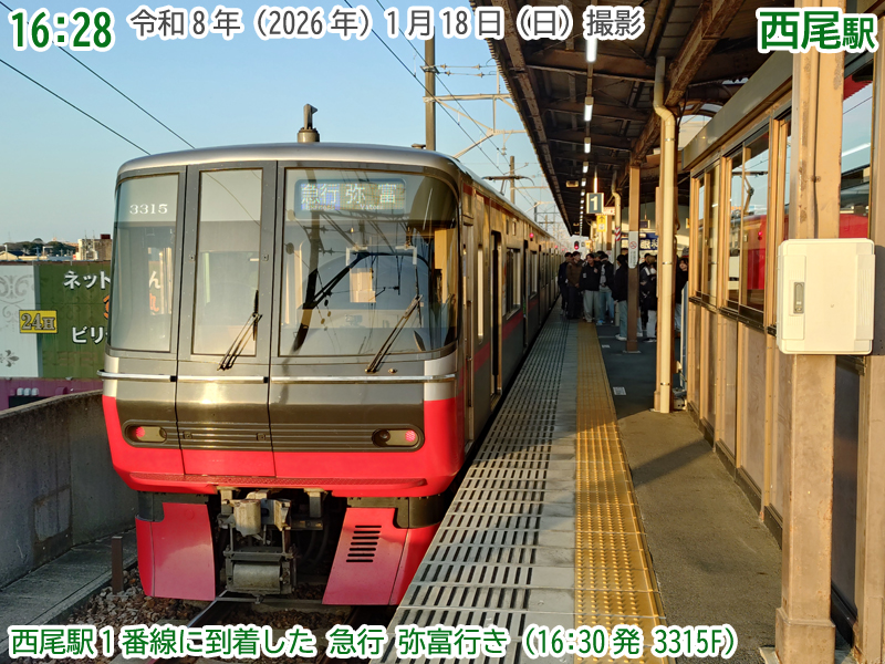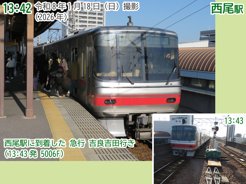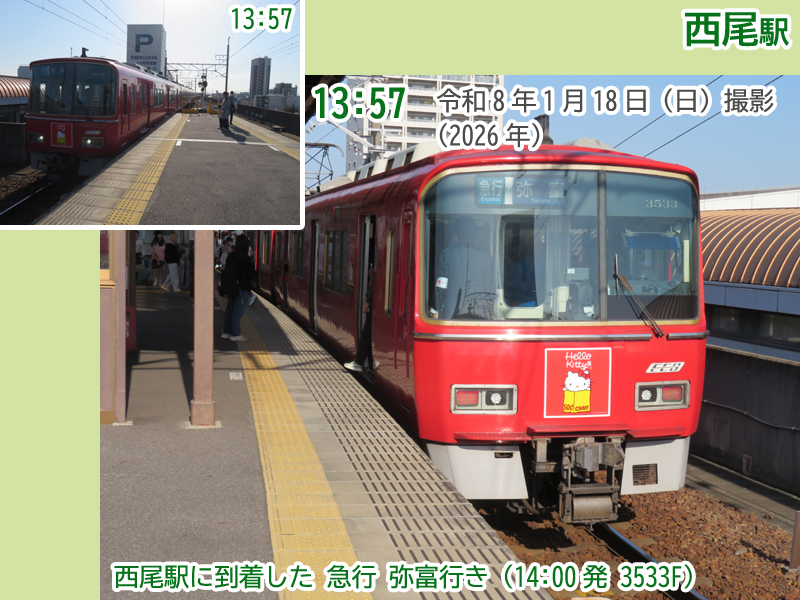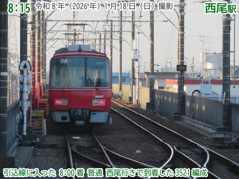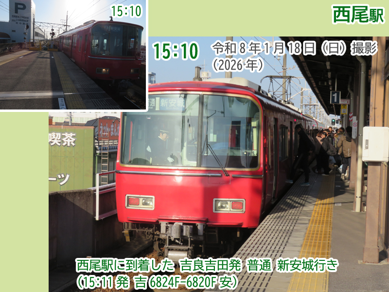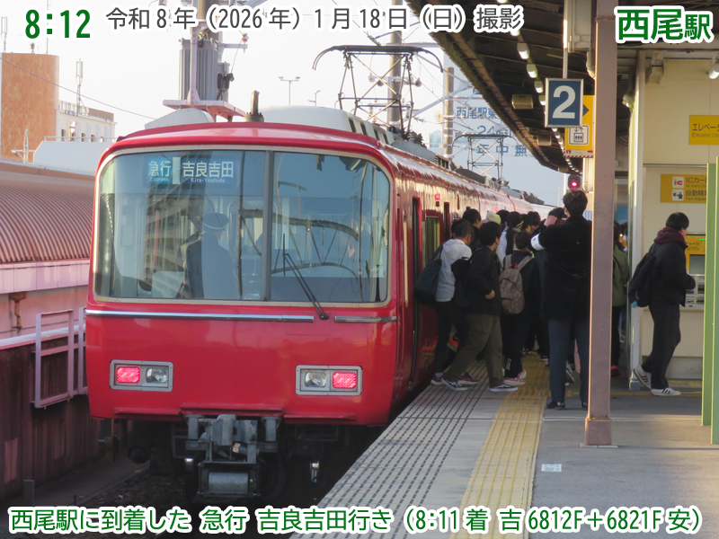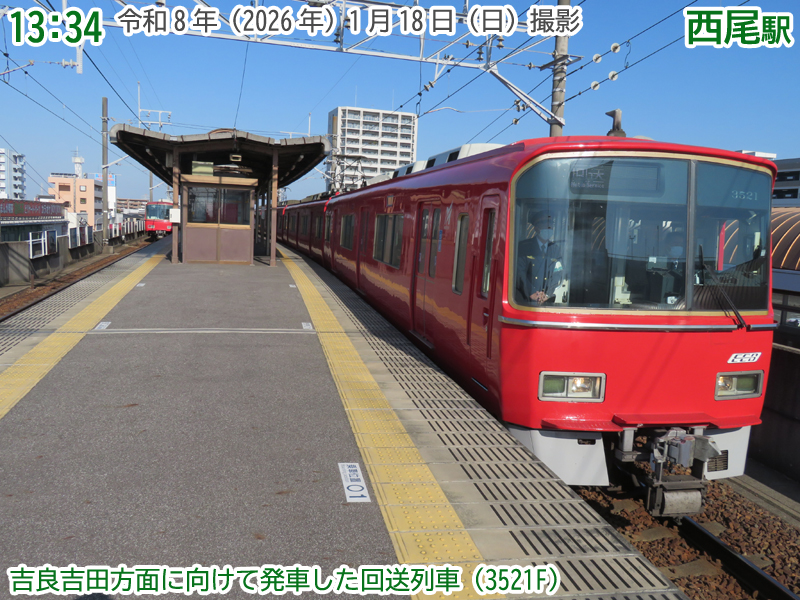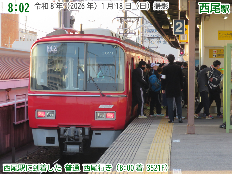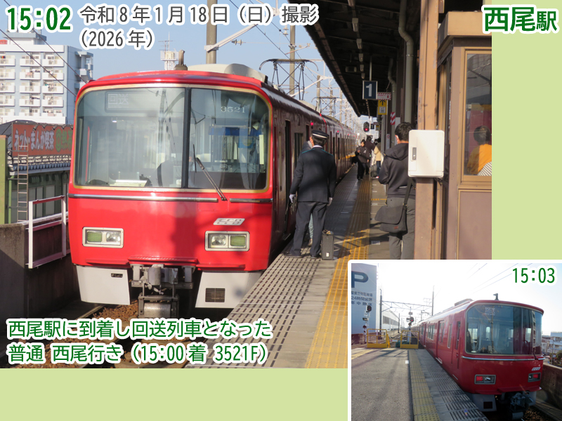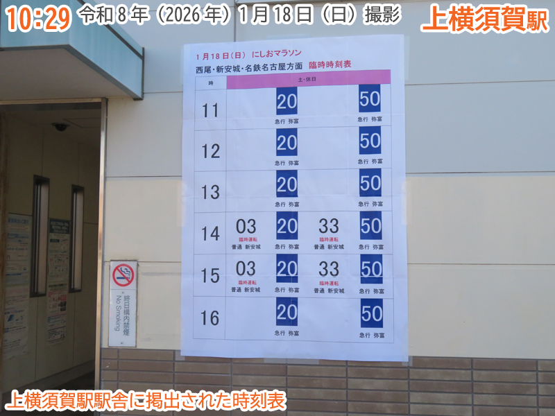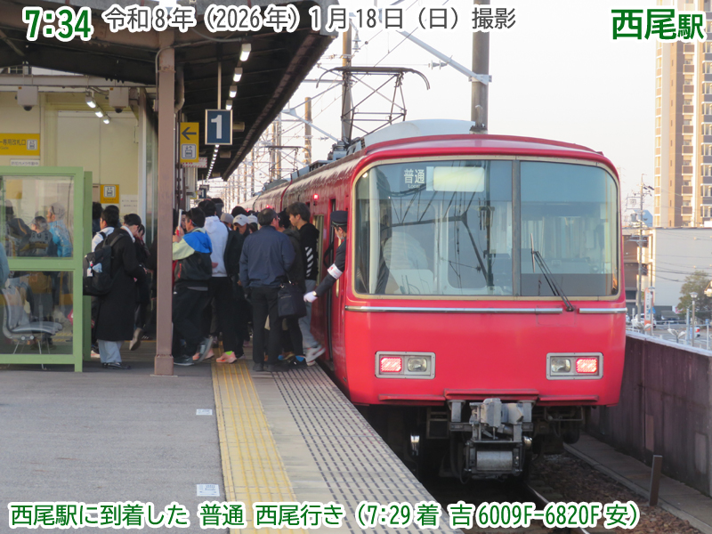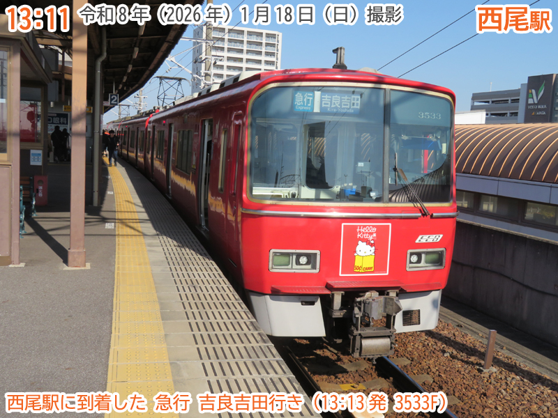 令和8年(2026年)1月18日の日曜日、西尾市内で『第4回にしおマラソン』が開催されました。フルマラソンは西尾駅が最寄りの西尾市役所を朝9時にスタートし、西尾市内をぐるっと周り、上横須賀駅が最寄りの横須賀公園がゴールとなります。西尾市長のブログによると、参加人数はフルマラソンの部に6,442人、5kmの部に471人、2kmの部に488人で合計7,401人と過去最高だったようで、西尾線もたくさんの人が利用していました。西尾線では輸送力を増強するため、臨時列車の運行や列車の区間延長がなされ、車両の増強も図られました。ということで、今年も結構なボリュームでその様子を紹介します。ちなみに、昨年度はここ、一昨年度はここで紹介しています。それでは、ご覧ください。 |