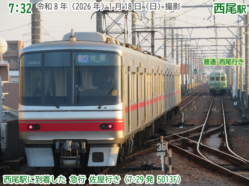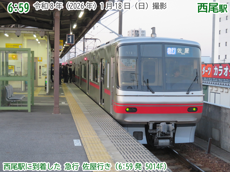 時刻は6時59分になりました。6時59分発の急行佐屋行きが到着です。にしおマラソンの系統板が掲出されています。いよいよ、今日ですね。