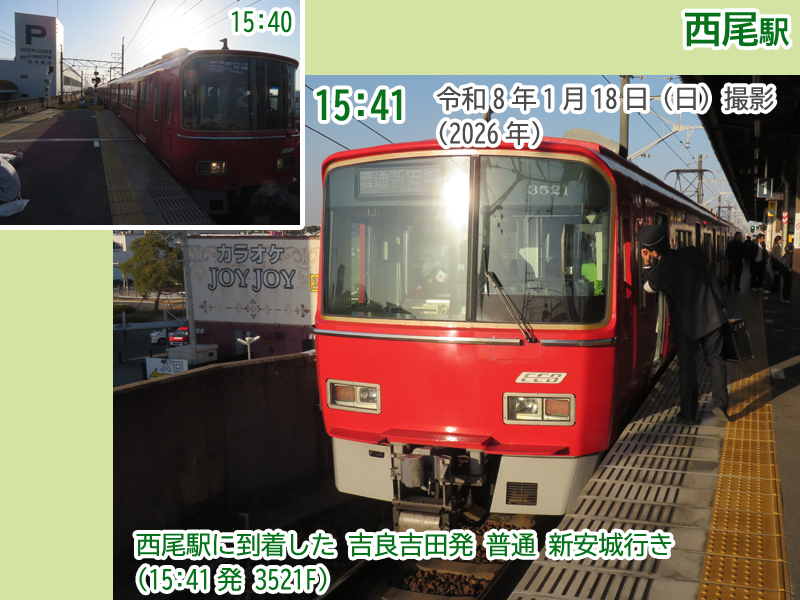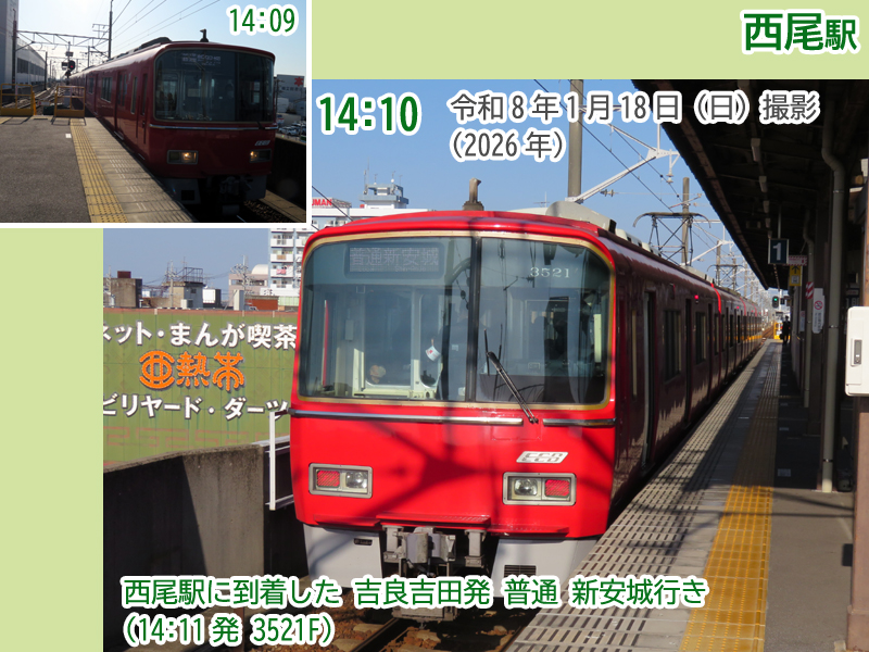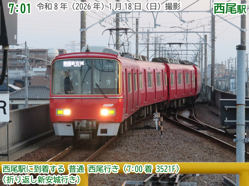 さらに、普通西尾行きが2番線に到着です。しかも4両編成の3500系。1本目の区間延長列車です。