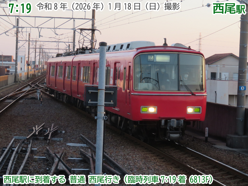 時刻は7時19分になりました。新安城方面から臨時列車の普通西尾行きが到着です。6800系の2両編成がやってきました。