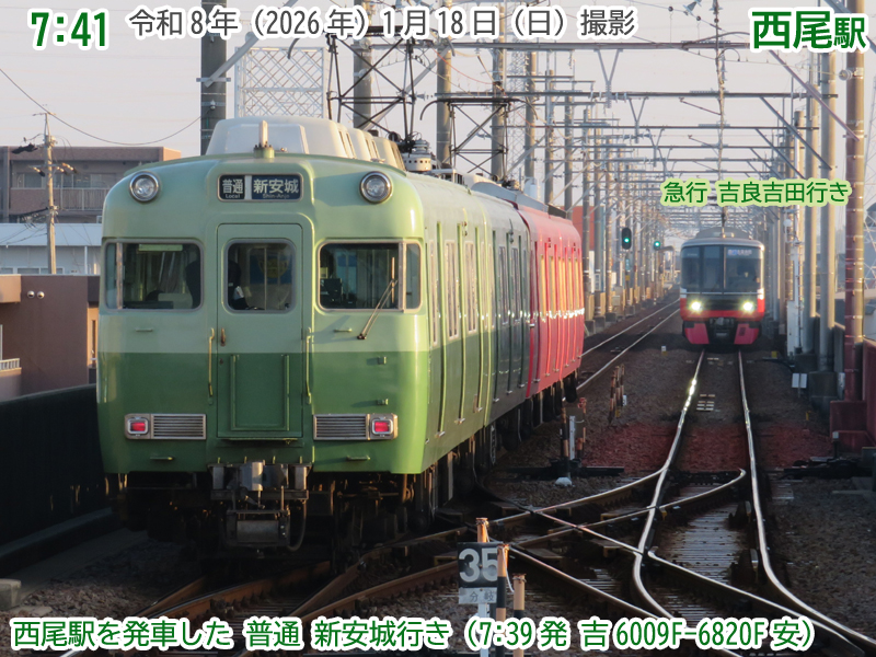 7時41分発の普通新安城行きが発車しました。複線区間で39分着の急行吉良吉田行きとすれ違います。多くの列車が微妙に遅れていますね。