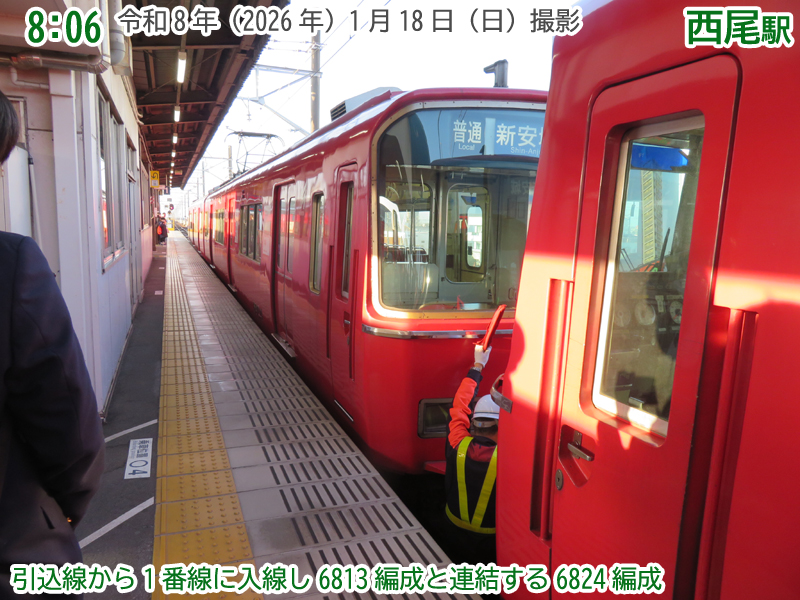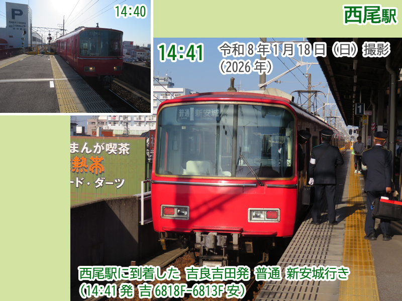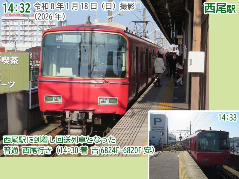 時刻は14時01分。1番線に普通西尾行きが到着し、回送列車になって吉良吉田方面へ向かって発車しました。この車両が2本目の吉良吉田駅始発の普通新安城行きになります。6800系の重連で、朝の臨時列車として使用された車両(6813F)に朝の紹介時には登場していない車両(6818F)を増結しています。