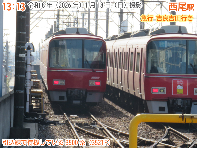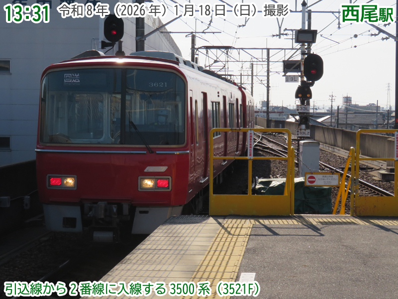 再び午後の西尾駅です。西尾駅の引込線には朝から引き続き3500系が留置されています。ってことを確認していただき、それでは西尾駅から運行状況を確認していきましょう。