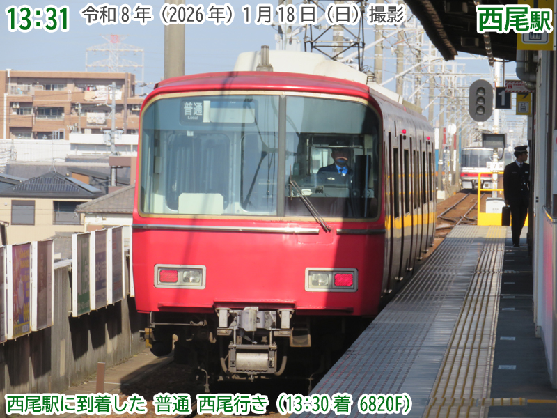 1番線に13時30分着の普通西尾行きが到着しました。6800系の2両編成です。