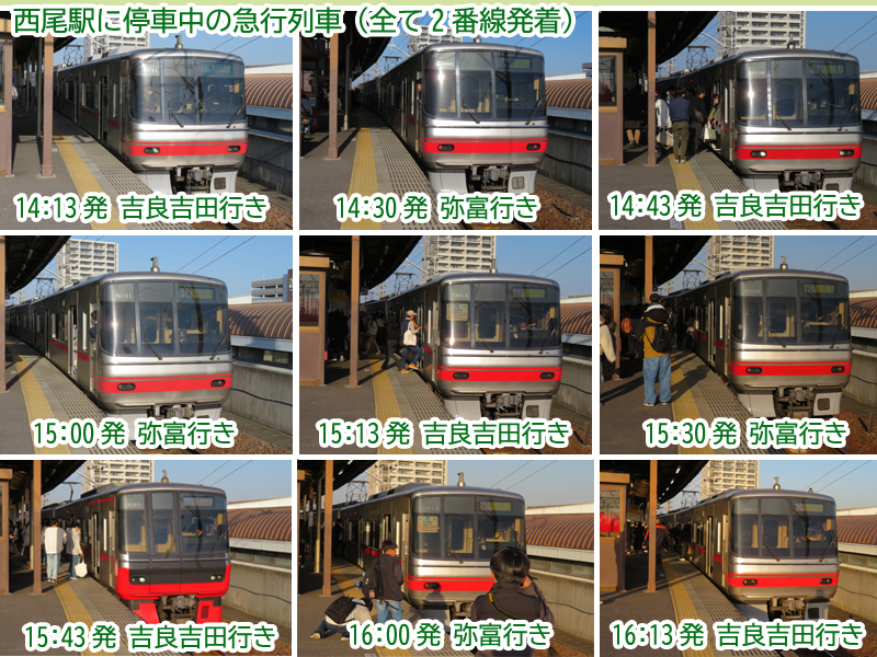 さて、ここまで飛ばしてきた急行列車を1画像に詰め込みました。14時13分発の吉良吉田行きから16時13分発の吉良吉田行きまでの9本です。どの列車も5000系かと思いきや1列車だけ違いますが、2番線の発着なのは同じです。標準ダイヤ時の急行は2番線発着です。